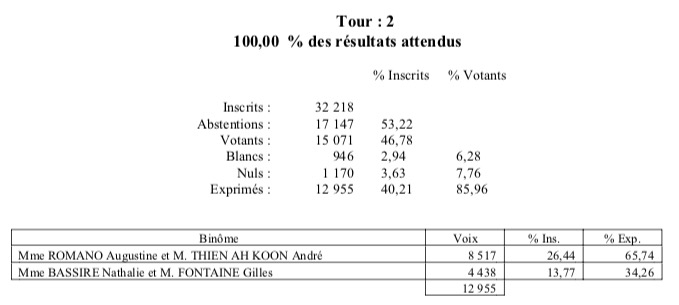 Sans surprise aucune, le binôme d'André Thien Ah Koon et Augustine Romano a raflé la victoire sur le canton 25 (Le Tampon 2). Il cumule 65,74%, contre 34,26% pour Nathalise Bassire et Gilles Fontaine. Il semblait peu probable que le maire du Tampon, André Thien Ah Koon, ne soit pas élu, cela est désormais confirmé (Photo d'illustration rb/www.ipreunion.com)
