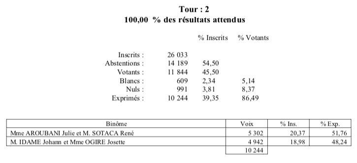 Le binôme de Julie Aroubani et René Sotaca remporte la victoire face à Johann Idame et Josette Ogire sur le canton 4 à Saint-André. Ils ne devancent que de peu leurs opposants, ayant comptabilisé 51,76% des suffrages contre 48,24% (Photo d'illustration rb/www.ipreunion.com)