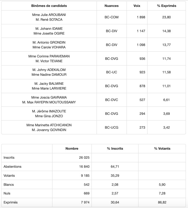 Le binôme de Julie Aroubani et René Sotaca arrive en tête dans le canton 4 avec 23,80%, soit 1.898 des votants. Il est suivi de loin par le duo Johann Idame et Josette Ogire, qui cumule 14,38%. Antonio Grondi et Carole Vohara arrivent troisièmes avec 13,77%, Corinne Paraveman et Victor Tevane quatrièmes avec 11,58% et Jacky Balmine et Marie Larivière sont cinquièmes avec 11,01% des votes (Photo d'illustration rb/www.ipreunion.com)
