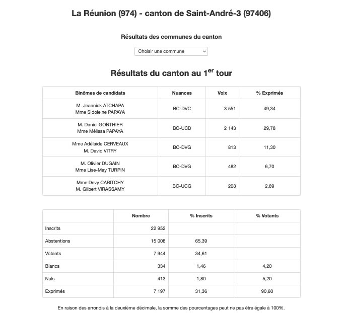 Le binôme Jeannick Atchapa et Sidoleine Papaya est en tête avec 49,34% des suffrages exprimés. Daniel Gonthier et Mélissa Papaya arrivent en deuxième position avec 29,78%. Le binôme Adélaïde Cerveaux et David Vitry arrive en troisième position avec 11,30% des suffrages exprimés. Le taux de participation est de 31,36%. Retrouvez le tableau détaillé ci-dessous. (photo d'illustration rb/www.ipreunion.com)