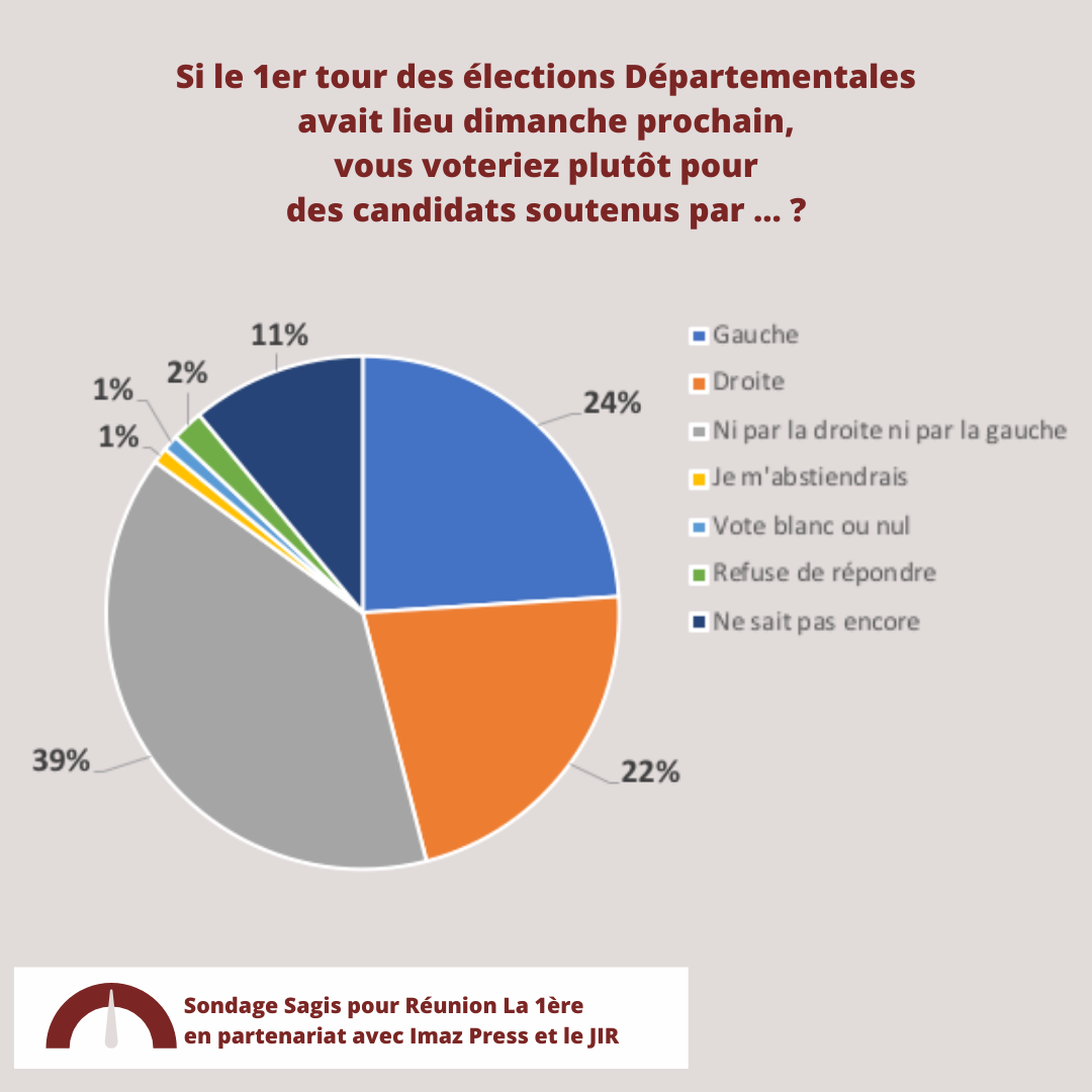 Contrairement aux régionales où les partis traditionnels font la course en tête des sondages, les Réunionnais semblent moins sensibles aux appareils politiques dans le cadre des départementales. En effet, ils sont 39% des personnes qui se disent certaines d’aller voter à exprimer une préférence pour des binômes issus ni de la droite, ni de la gauche.