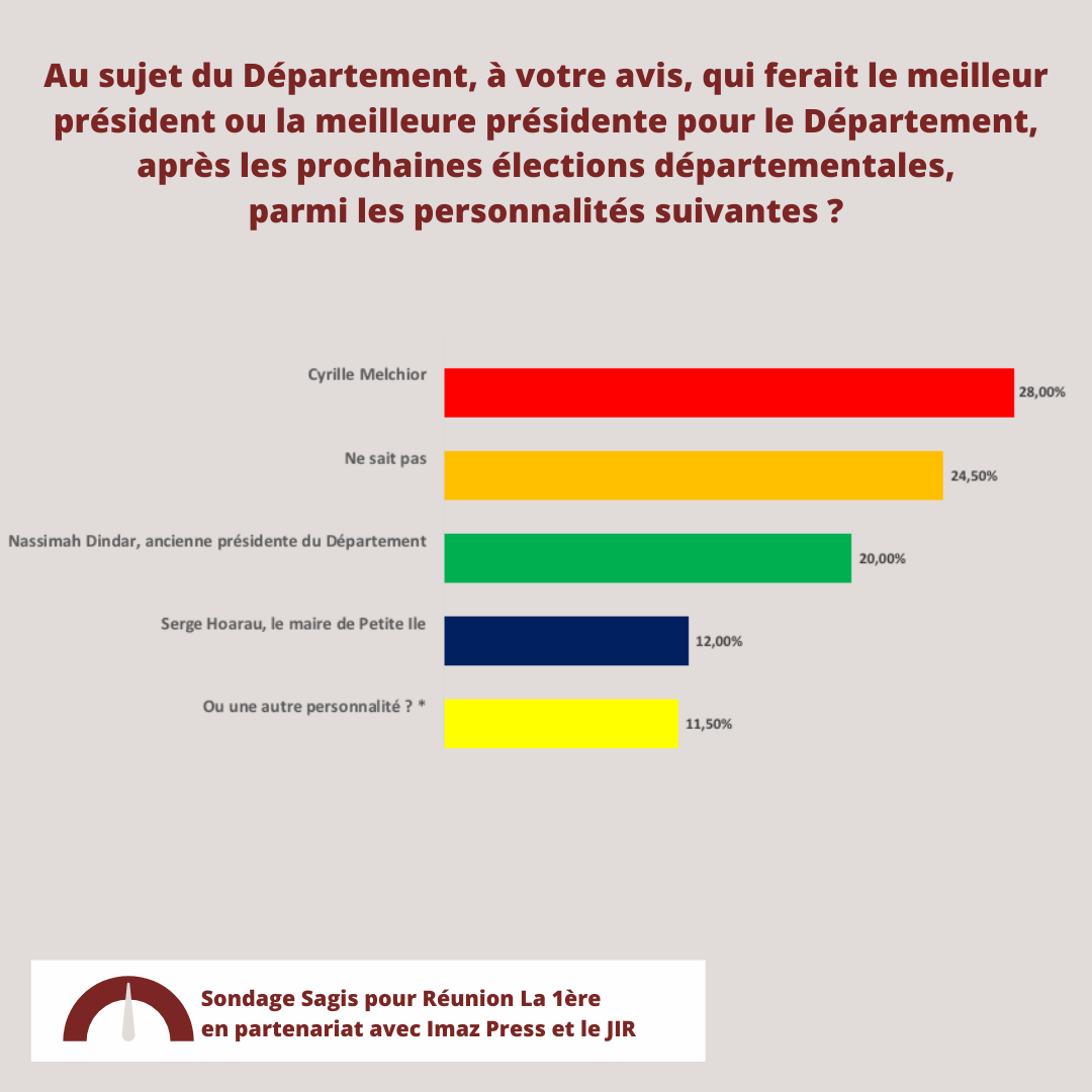 Ce sondage s’est également aventuré dans le difficile exercice de la préférence des Réunionnais concernant ce futur exécutif. Sans grande surprise, le président actuel, Cyrille Melchior, recueille 28% de préférence au sein des personnes certaines d’aller voter. "C’est une prime au sortant, naturelle. Les présidents du Département, à La Réunion, jouissent généralement d’une bonne popularité", souligne Philippe Fabing. Rappelons que Cyrille Melchior a d’ores et déjà annoncé qu’il était candidat à sa propre succession en cas de réélection sur son canton.