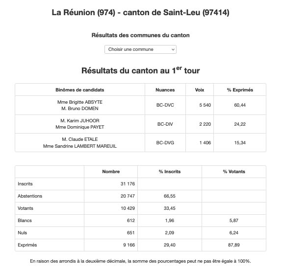 Les résultats annoncés sur le canton numéro 14 à Saint-Leu donnent le binôme Brigitte Absyte - Bruno Domen largement majoritaire avec un score de 60,44%. Un score qui n'est pas surprenant dans la commune du maire-candidat Bruno Domen. Derrière eux se trouvent le binôme Karim Juhoor - Dominique Payet qui cumulent 24,22% des voix. En troisième position arrivent Claude Etale et Sandrine Lambert-Mareuil dont le binôme emporte 15,34% des voix. Le taux de participation est de 29,40%. Retrouvez le tableau détaillé ci-dessous. (Photo d'illustration rb/www.ipreunion.com)