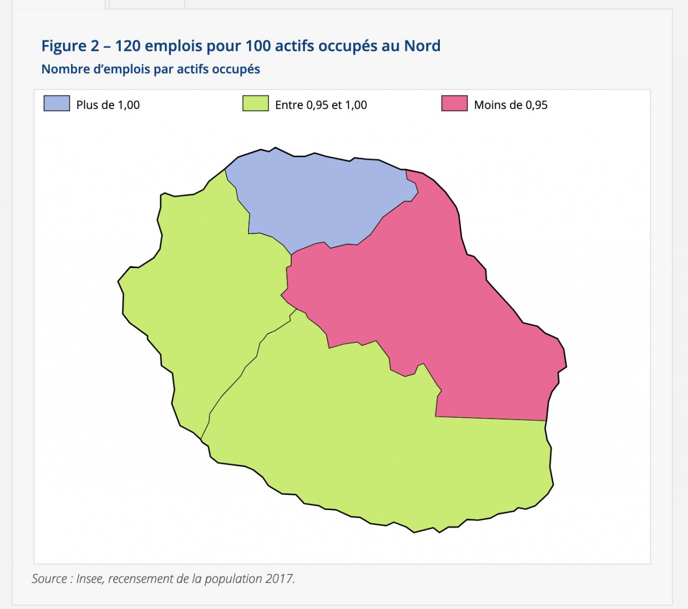 "Les zones d’emploi réunionnaises se démarquent peu les unes des autres en termes d’orientation économique dominante, contrairement à d’autres territoires ultramarins. "Néanmoins, l’emploi est un peu plus fréquent dans de grandes unités publiques au Nord, l’Ouest compte un peu plus d’emplois dans le commerce, l’hôtellerie et la restauration, tandis que les zones Est et Sud concentrent davantage d’emplois agricoles.
