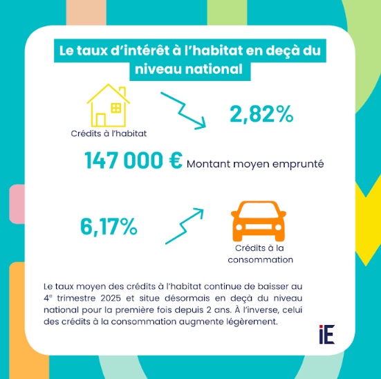 Le taux moyen des nouveaux crédits à l’habitat baisse au 4e trimestre 2025 et repasse ainsi en deçà du niveau national pour la première fois depuis 2 ans. Il s’établit à 2,82 % à La Réunion, contre 2,99 % au niveau national.