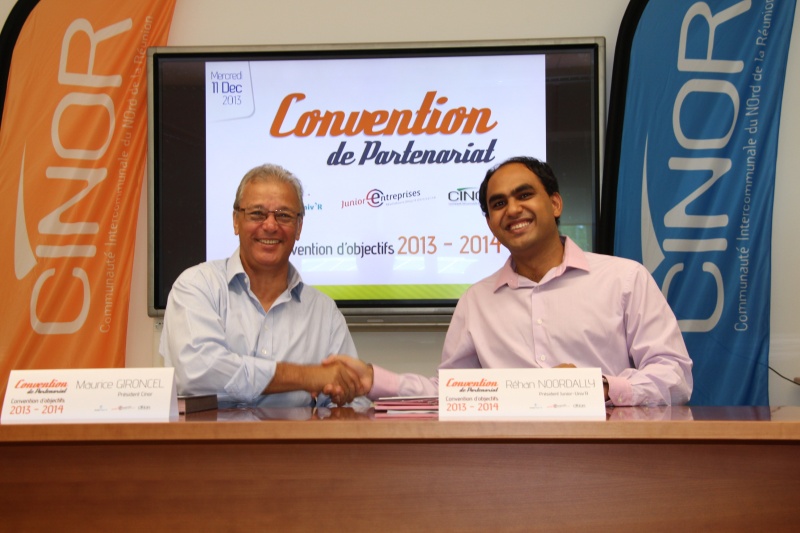 La Cinor a signé ce mercredi 11 décembre 2013 une convention avec Junior Univ'R. Ce partenariat est effectif pour les années 2013 et 2014. La communauté intercommunale débloquera une aide au fonctionnement de l'association étudiante de 2 500 euros pour 2014. Une aide aux contrats de prestations est également prévue pour les entreprises présentes sur le territoire de la Cinor, une subvention qui peut atteindre jusqu'à 3500 euros par an. Les projets concernant des entreprises qui ne sont pas sur le territoire de la communauté du Nord pourront bénéficier d'un tarif réduit dans le "fab lab", le laboratoire de fabrication où sont mis à disposition des outils pour la création. Une "gratuité partielle" sera accordée pour les entreprises de la micro-région nord. La Cinor accompagnera également la campagne de communication de Junior Univ'R à hauteur de 1 000 euros. (photo D.R.)