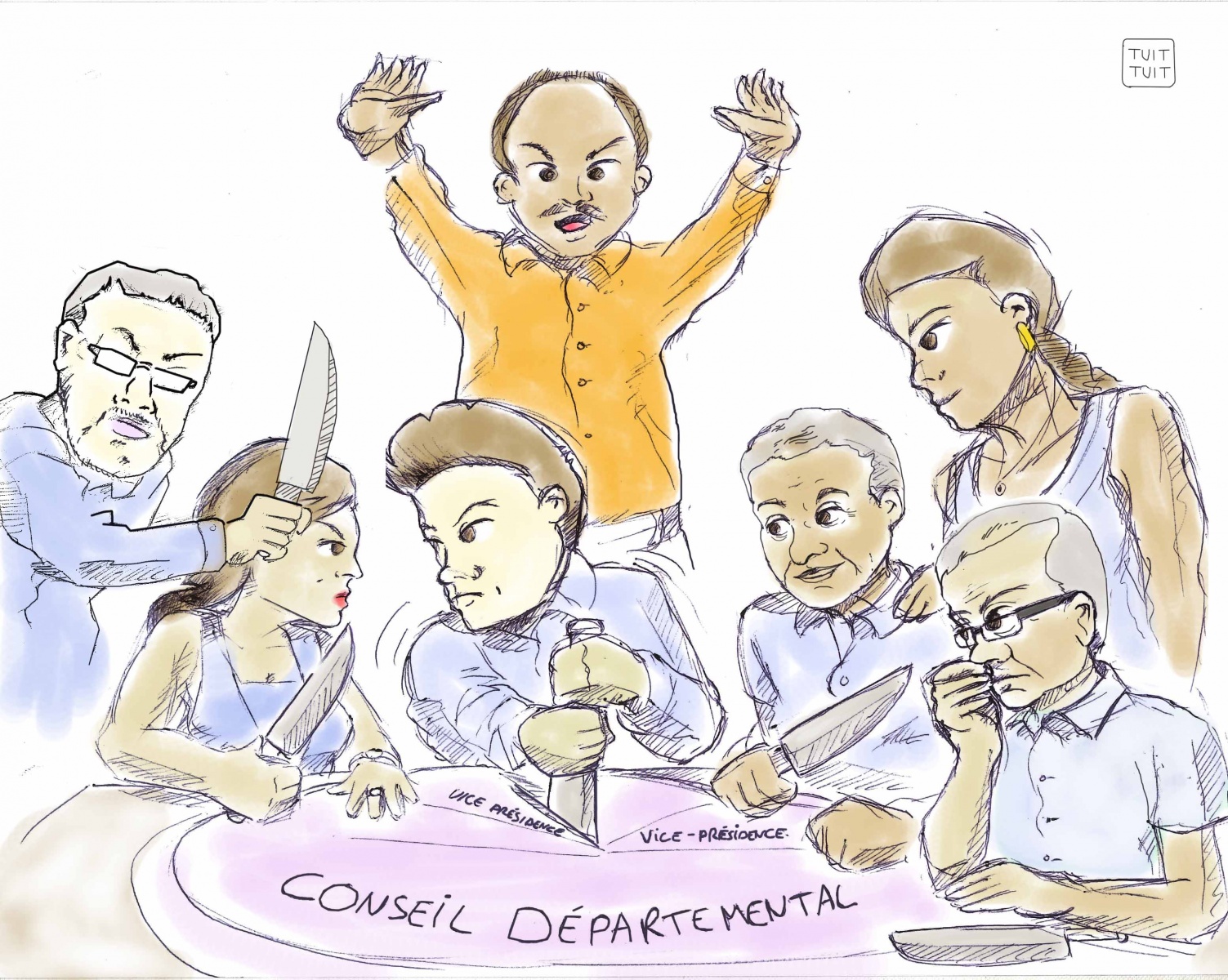 13h24 : Pause caricature : en attendant ce nouveau vote, le partage des places de vice-présidents a inspiré Joris. Michel Fontaine, Nassimah Dindar, Didier Robert, Joseph Sinimalé, Sandra Sinimalé, Jean-Paul Virapoullé (et derrière Thierry Robert) découpent le gâteau départemental.