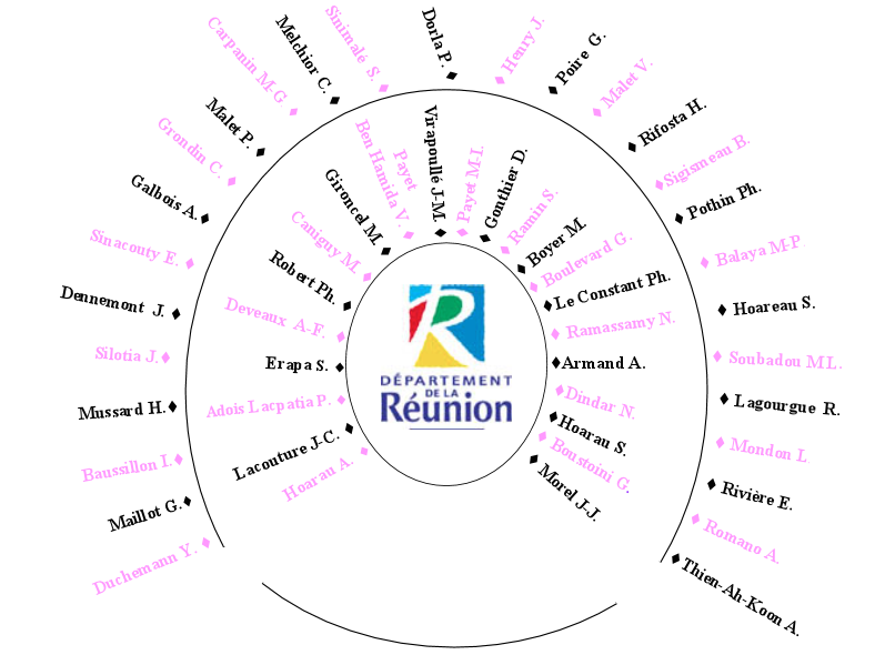 12h50 : Dans l'ordre d'importance des élus, la liste de l'union de la droite est composée de : Cyrille Melchior, Viviane Malet, Jean-Jacques Morel, Sandra Sinimalé, Daniel Gonthier, Baétrice Sigismeau, Jean-Marie Virapoullé, Nadia Ramassamy, Jean-Claude Lacouture, Sabrina Ramin, Serge Hoarau, Claudette Grondin, Rémy Lagourgue, Marie-Paule Balaya, Alix Galbois, Marie-Isabelle Payet... C'est cette équipe qui devrait diriger le département.