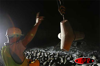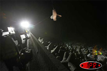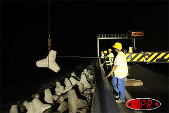 La man?uvre est délicate, les tétrapodes pèsent plus de 8 tonnes. Ils doivent être déposés en douceur le long de la carapace de la route du littoral. Pour ne pas gêner la circulation, les équipes de la DDE (direction départementale de l'Équipement) et de la société de travaux publics SBTPC travaillent de nuit au renforcement côté mer de cet axe de circulation. Du coup, la route est totalement fermée aux véhicules de de 20 heures à 5 heures, soit le temps nécessaire à la pose d'environ 70 blocs de pierres.Entreposés au Port, ces tétrapodes sont transportés sur les lieux du chantier par 4 camions assurant chacun 6 rotations par nuit. Au final 700 mètres de littoral seront ainsi renforcés