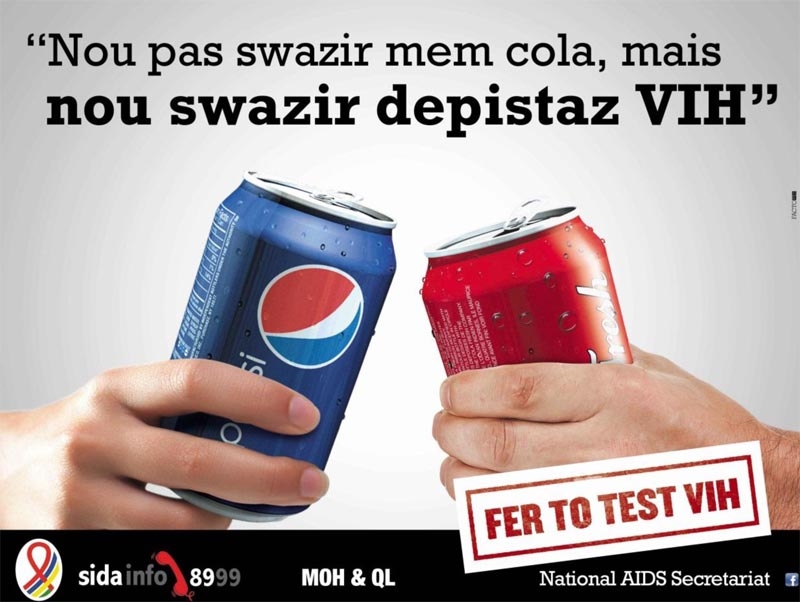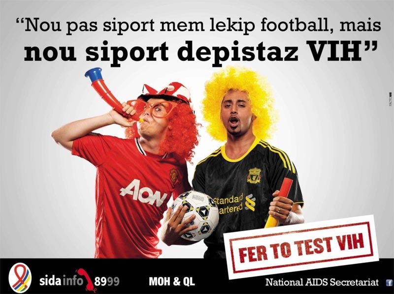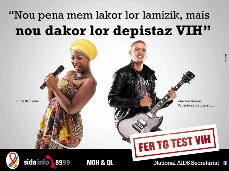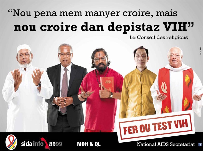 "Nou pena mèm manyer croire mais nou croire dan dépistaz VIH ("nous n'avons pas la même façon de croire mais nous croyons en le dépistage du VIH", en créole mauricien). Le message s'étale en gras en tête d'une affiche où pose cinq membres du conseil des religions - une structure représentant toutes les religions pratiquées à Maurice. Le même message, adapté à chaque situation, est décliné sur d'autres affiches mettant en scène des artistes, des buveurs de soda et des sportifs. L'initiative est à mettre au compte du National Aids Secretariat (NAS), une unité spécialisée dans la lutte contre le Sida, directement rattaché au bureau du Premier Ministre mauricien.