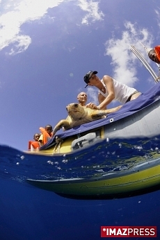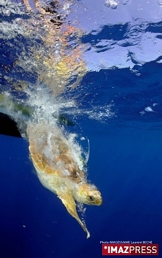 Josette, la jeune tortue caouanne recueillie par le centre de soin de Kélonia à Saint-Leu, vogue en pleine mer depuis ce vendredi 12 décembre 2009 (photo Imagessaime - Laurent Bèche). Sous le regard de ses parrains et marraines, les enfants de l'école primaire Raphaël Barquissau de Saint-Louis, elle a regagné son milieu naturel après avoir été soignée. Elle avait été capturée accidentellement le 13 novembre au large de La Réunion.
