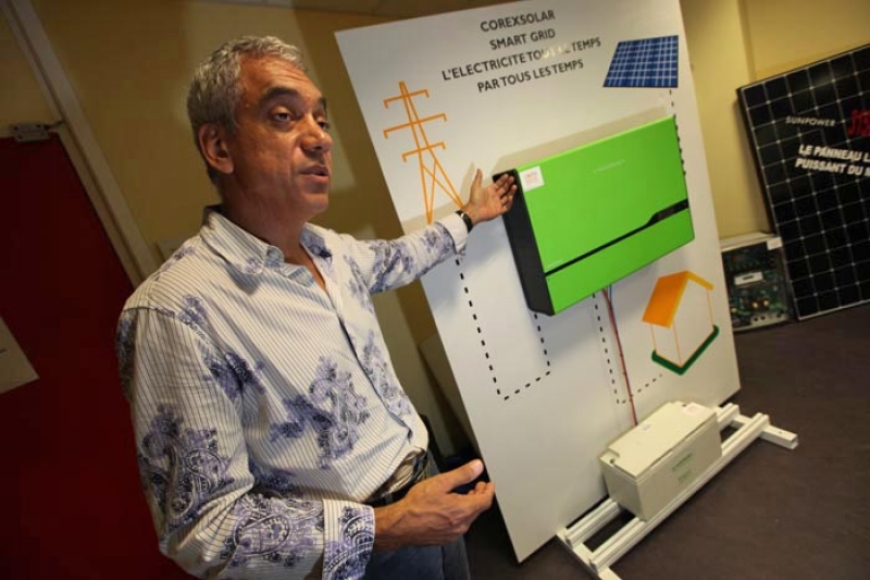 "Smartgrid, c'est la solution à l'intermittence de l'énergie. Elle ouvre de nouvelles perspectives au développement du photovoltaïque", lance Patrice Galbois. Cette technologie développée par une entreprise néerlandaise en partenariat avec Corex qui est une première sur l'île est "le fruit d'une réflexion menée depuis plusieurs années". "Elle permet le stockage, la revente et l'autoconsommation de l'énergie produite", détaille le chef d'entreprise.