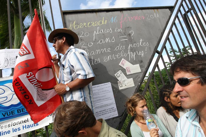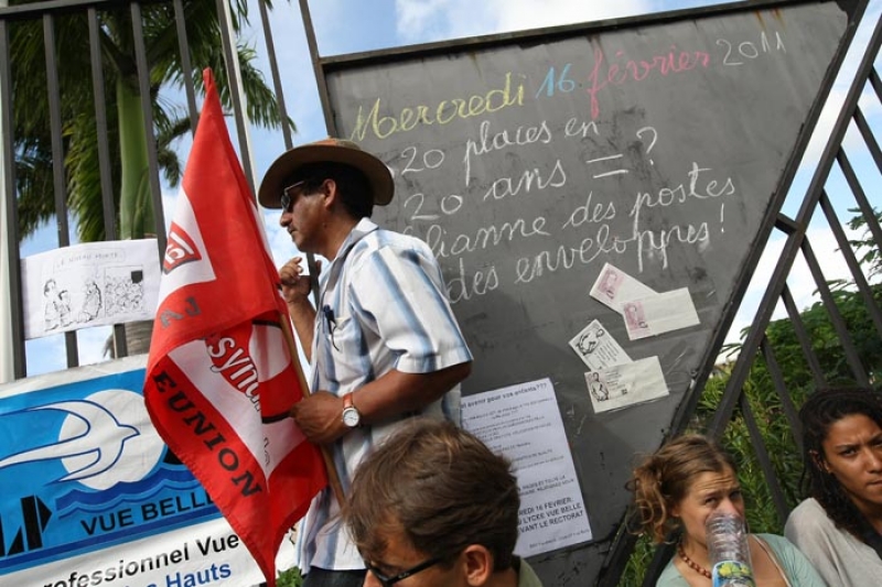 Enseignants, lycéens, étudiants et même politiques, près de 150 personnes étaient réunies devant le Rectorat pour dénoncer la suppression de 162 postes à la rentrée prochaine, conformément à la politique nationale de non remplacement d'un départ à la retraite sur deux. "La Réunion est dans une situation sociale et économique particulière. Supprimer autant de postes, c'est précariser le métier d'enseignant et ne pas garantir un enseignement de qualité aux élèves", dénonce Eric Hoarau de l'Unsa.Même son de cloche du côté de Lionel Millot, du Snes Fsu qui demande "le gel pur et simple de ces suppressions". Demande qui a été soumise au recteur lors d'une rencontre entre une délégation composée exclusivement de représentants de la FSU et l'UNL et Mostafa Fourar. Ce qui a un brin "agacé" les syndicats exclus comme l'Unsa et le Snalc. "Mais nous ne voulons pas entrer dans la polémique. Aujourd'hui, c'est l'unité qui prévaut", insiste Eric Horau.
