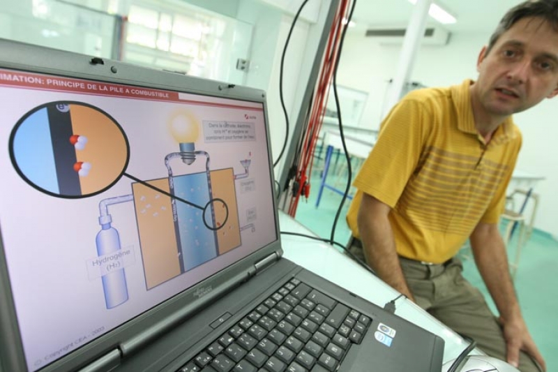 La pile à combustible permet de convertir une énergie chimique en énergie électrique. Concrètement, l'oxygène et l'hydrogène sont véhiculés dans la pile pour produire à la fois de l'électricité, de l'eau et de la chaleur. Les étudiants peuvent ensuite simuler l'utilisation de cette énergie électrique et son adaptation à différentes échelles (un appareil isolé, une maison, une quartier voire une ville) à l'intérieur d'une "charge active". "L'objectif est de démystifier l'utilisation de l'hydrogène. Il est souvent vu comme un produit explosif", explique le professeur Jean-Pierre Chabriat, directeur de la Faculté des sciences à l'Université de La Réunion et du Laboratoire énergétique, électronique et procédé.Le laboratoire dirigé par Jean-Pierre Chabriat effectue des recherches dans le domaine de l'énergie, notamment le gisement solaire, le photovoltaïque, les réseaux intelligents et le stockage de l'énergie. La pile à combustible pourrait permettre aux chercheurs de développer leurs connaissances dans ce dernier domaine. En effet, à La Réunion, l'énergie intermittente (photovoltaïque et éolien) est en plein développement. Selon EDF, elle ne peut pas représenter plus de 30% de l'énergie circulant sur le réseau. Se pose alors la question du stockage de l'électricité. Un stockage qui peut se faire notamment à l'intérieur de batteries, ou en transformant l'énergie en hydrogène grâce à un "électrolyseur". La pile combustible permet ensuite de transformer à nouveau cet hydrogène en énergie électrique.