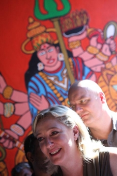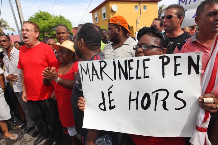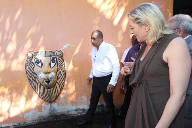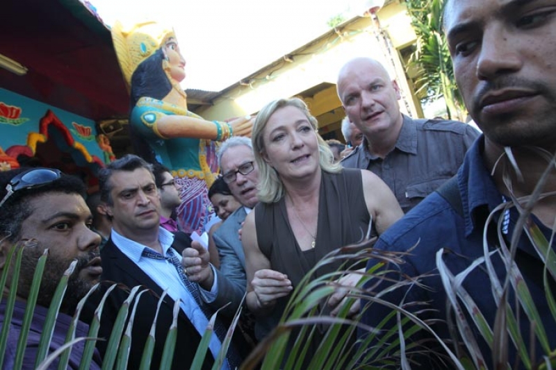 Marine Le Pen, présidente du Front National, est arrivée à 16 heures 05 au temple tamoul de l'Étang du Gol à Saint-Louis. Sa voiture s'est engouffrée aussitôt dans la cour du temple. Une arrivée sous les huées et quolibets des manifestants anti Front National, menés par Claude Hoarau, maire PCR de Saint-Louis. Ces derniers ont été contenus par le cordon de gendarmes mobiles. Des tracts clamant "Front national=incitation à la haine raciale" ont également été lancé. Les portes du temple se sont ensuite refermées sur les manifestants pendant que Marine Le Pen visite le temple. Hormis de répéter son credo pour "l'arrêt de l'immigration" et pour favoriser l'emploi des Français, Marine Le Pen n'a pas proposé de réelles solutions pouvant s'appliquer à La Réunion