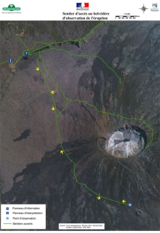 "L'éruption est désormais stabilisée. Le trémor, bien que légèrement fluctuant s'est largement atténué par rapport au début de l'éruption. Une bouche principale éruptive continue de dégazer de façon importante", constate la préfecture.Le sentier qui conduit au site du " Château Fort " a été balisé par les services de l'ONF et un point d'observation du site de l'éruption a été aménagé. Le parcours est exigeant, il est réservé aux randonneurs déjà aguerris et exige quatre heures de marche tant à l'aller qu'au retour. Le point d'observation du cratère du Dolomieu n'a quant à lui pas souffert des purges et des éboulis suite à la décompression qui a suivi l'éruption.