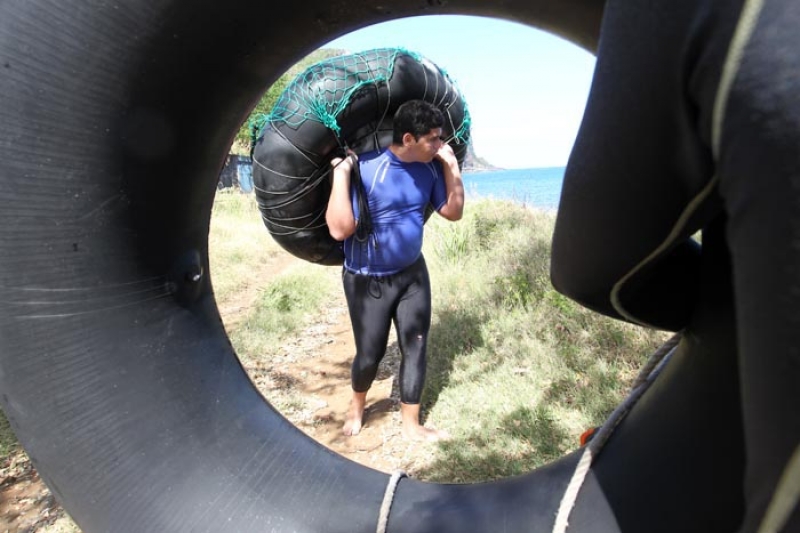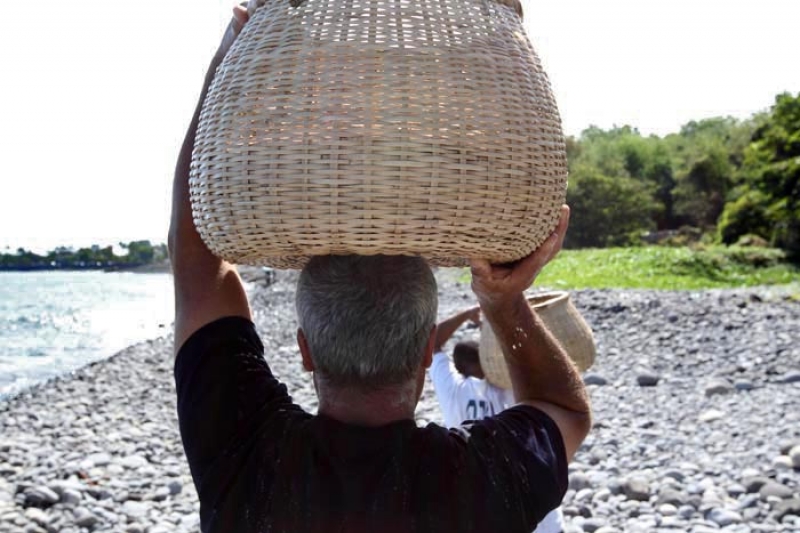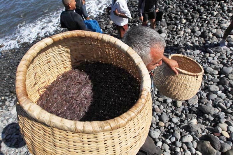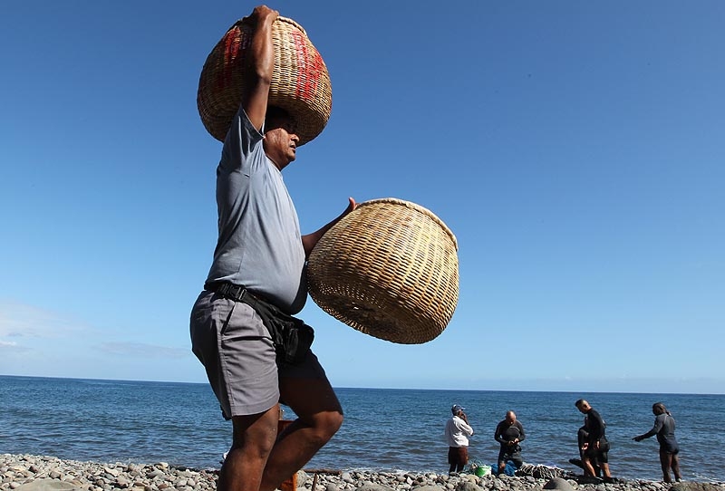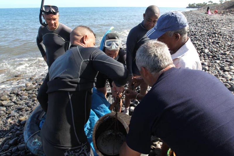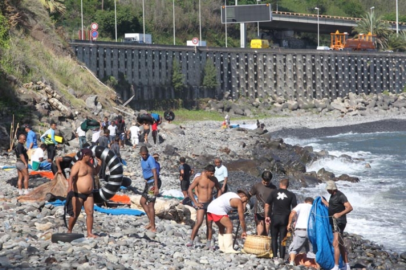 Les premiers pêcheurs sont arrivés dès 4 heures du matin ce mardi. Les filets à mailles très fines ont été tout de suite lancés. Les pêcheurs travaillent en équipes. Certains sont installés dans de grosses bouées en caoutchouc noir, d'autres nagent avec leurs palmes et leurs tubas. Tous attendent de prendre au piège les bichiques avides de goûter aux grands espaces de l'océan. Beaucoup n'y sont jamais parvenus.Les premières prises ont eu lieu dès le lever du jour. "Na poin bokou. Nou la gaign 5, 6 kilo soloman" regrette un pêcheur. "La line lé pa trop bon dawar" croit savoir l'un de ses collègues. Un peu plus loin, la pêche est plus importante. Il faut deux hommes pour mettre un panier plein à ras bord sur la tête d'un troisième. "Nou lé la dopi gran matin mèm. Astèr lé trop tar, i gaign pi ryen la" lance l'un des pêcheurs chanceux. Avec ses équipiers il a ramené au bord près de 40 kilos d'alevins.