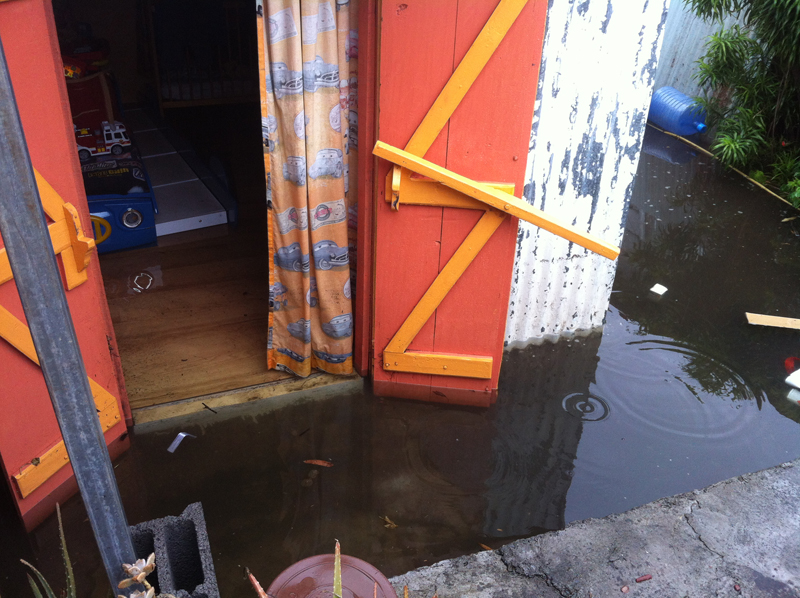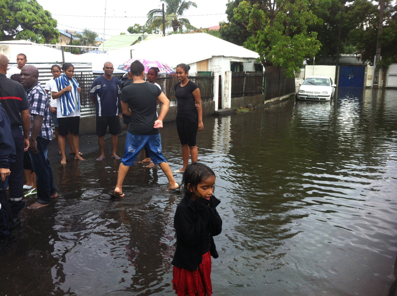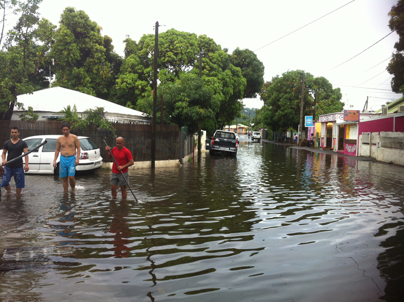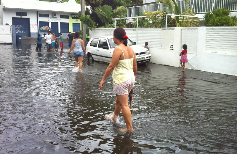 Depuis ce dimanche 10 février 2013, de fortes pluies s'abattent sur le Sud et l'Ouest de l'île. La ville de Saint-Paul est particulièrement touchée. Résultats : en centre-ville, les rues des Sables et Marius et Ary Leblond sont complètement inondées. Plusieurs centimètres d'eau recouvrent la chaussée. L'eau est entrée dans les cases de plusieurs riverains. En cause, selon Lynda Hoarau, élue à la municipalité de Saint-Paul, interrogée par Radio Festival, des bouches d'évacuation obstruées par du sable. À noter qu'il n'y a pas d'avis de vigilance fortes pluies en cours. Ces averses devraient s'estomper en fin de journée, selon Météo France (photo Carolina Ferrère/Radio Festival).