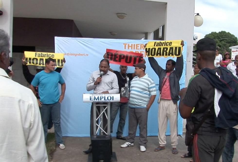 Ainsi, scandant "Fabrice Hoarau député" et brandissant des affiches au nom de ce dernier, les militants ont tenté de perturber le discours du maire de Saint-Leu, et ont jeté des tracts. Selon Thierry Robert, dans un communiqué, ces personnes sont "apparentées à Fabrice Hoarau", candidat du PCR dans la 7ème circonscription. "Malgré ces tentatives de pression", Thierry Robert a poursuivi son intervention, en déclinant ses propositions sur l'emploi et la formation.Selon un membre de l'entourage de Fabrice Hoarau, "il est évident, que dans une ville, bastion du parti communiste réunionnais, sillonnée par des équipes de jeunes militants, qu'en débarquant en pleine ville et heures ouvrables, il y aurait eu un "entourage" devant Thierry Robert". Il regrette que le maire de Saint-Leu n'ait averti personne "en débarquant devant Pôle Emploi", déclinant ses propositions, surtout "dans un quartier sensible". "C'est un acte délibéré de provocation", affirme-t-il.