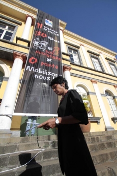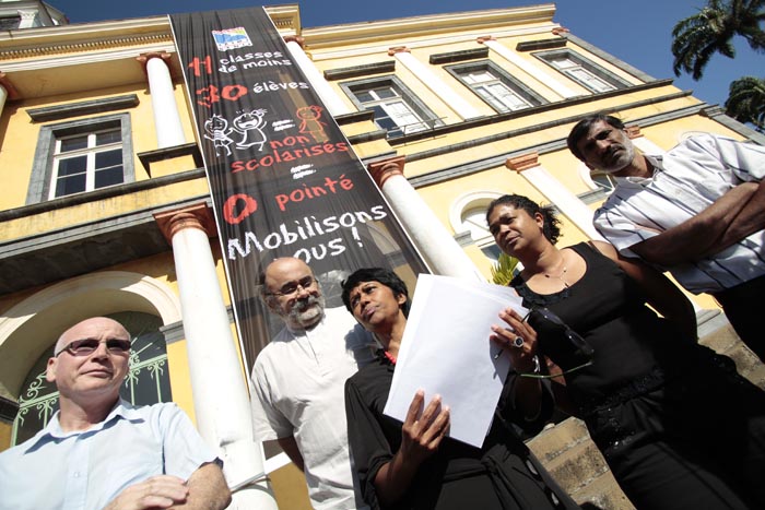 Porté par le vent, le kakemono, une longue banderole noire, descend le long de la façade de l'ancienne mairie de Saint-Denis. "11 classes en moins + 30 élèves non scolarisés = zéro pointé. Mobilisons nous", la phrase s'inscrit en gras sur un fond noir. En signe de deuil. "Car c'est véritablement l'avenir de nos enfants que l'on enterre" commente l'un des élus présents devant la mairie ce vendredi matin.C'est la non scolarisation d'une trentaine d'enfants qui a déclenché la colère de la mairie. Ericka Bareigts rappelle que la commune dionysienne "a tiré la sonnette d'alarme dès le mois de juin dernier". Le recteur avait alors annoncé la fermeture de 11 classes à Saint-Denis. "Nous lui avons indiqué que la population scolaire allait augmenter, de fait elle est passée de 17 925 élèves en 2010 à 18 228 en 2011, et qu'il fallait prévoir des classes en conséquent" souligne l'adjointe au maire. "Il a promis de le faire. Nous ne l'avons pas vraiment cru. Nous avions raison puisqu'à la rentrée une cinquantaine d'enfants n'avait pas de place dans les établissement scolaires" remarque-t-elle.
