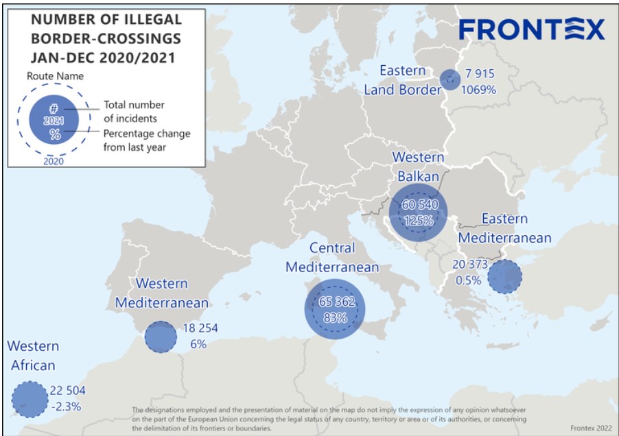Selon les données officielles de l'agence Frontex, le nombre de "franchissements de frontières illégaux" a été infiniment plus réduit en 2021 et s'est ainsi élevé à près de 200.000, dont une petite majorité en Méditerranée centrale.