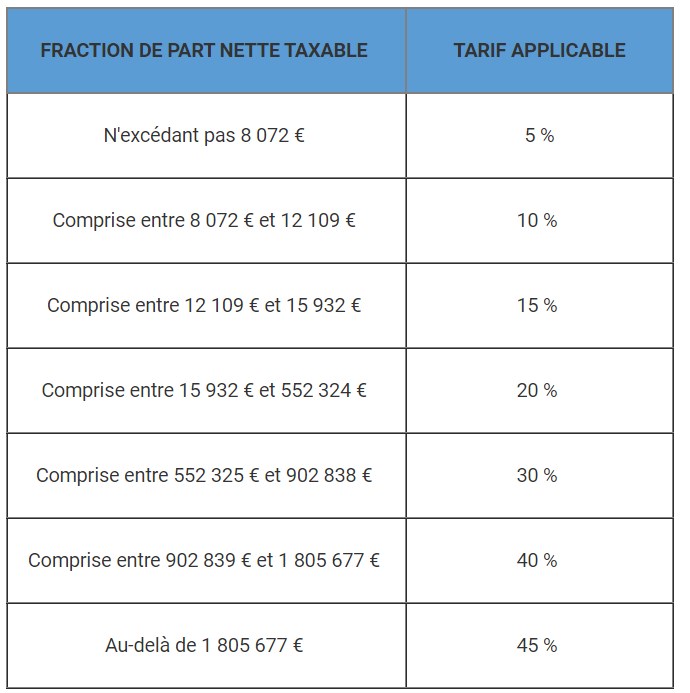 Au-delà de cette somme s'applique un barème progressif par tranche qui va de 5% pour les sommes inférieures à 8.072 euros à 45% pour celles excédant 1,8 million d'euros.