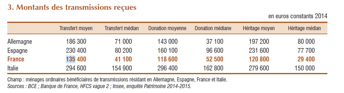L'écrasante majorité des successions se font donc en "ligne directe" et sont pour la plupart exonérées d'impôts car elles portent sur des montants inférieurs au seuil de 100.000 euros. Selon l'Insee, le montant médian des transferts successoraux en France s'élevait ainsi en 2014 à 41.100 euros.