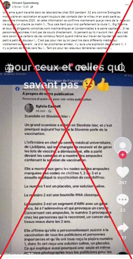 "Un grand scandale a éclaté en Slovénie hier, et c’est pourquoi aujourd'hui toute la Slovénie parle de la vaccination", affirme l'auteur d'une publication relayée d'abord sur Tik Tok puis sur Facebook le 4 février 2022. Selon l'auteure de cette publication, "l'infirmière en chef du centre médical universitaire, de Ljubljana, qui est chargée de recevoir et de gérer les lots de vaccins, a démissionné". "Devant les caméras", elle aurait "montré aux gens les codes sur les ampoules (des vaccins, ndlr) marquées des codes de chiffres 1, 2 ou 3": le 1 correspondrait à un placebo, le 2 à "une bouteille RNA classique" et le 3 à "un segment d'ARN avec un gène onco, lié à l'adénovirus et qui provoque un cancer. Concernant ces ampoules, le numéro 3 provoquera chez les personnes qui le recevront un cancer des tissus mous dans les 2 ans", affirme l'auteure de cette fausse publication.
