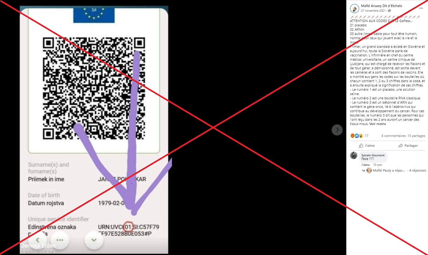 Vera Kanalec explique que ce chiffre peut être trouvé sur le certificat Covid numérique européen, dans l'identifiant unique de certificat après les lettres "URN:UVCI". Sur Facebook, une internaute française a partagé une capture d'écran d'un pass sanitaire, entourant l'endroit où est supposé être indiqué le chiffre correspondant au type de vaccin reçu.