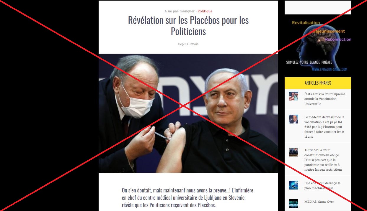 Des publications similaires circulent depuis au moins novembre 2021 sur Facebook. Certaines partagent des articles, comme celui-ci, publié sur le site "1scandal.com" et intitulé "Révélation sur les placebos pour les politiciens", car selon ces publications, les politiques ne reçoivent que la dose placebo. D'autres publications, comme celle-ci, partagent une vidéo, issue de la page Facebook d'un site slovène, dans laquelle on voit la femme en question.