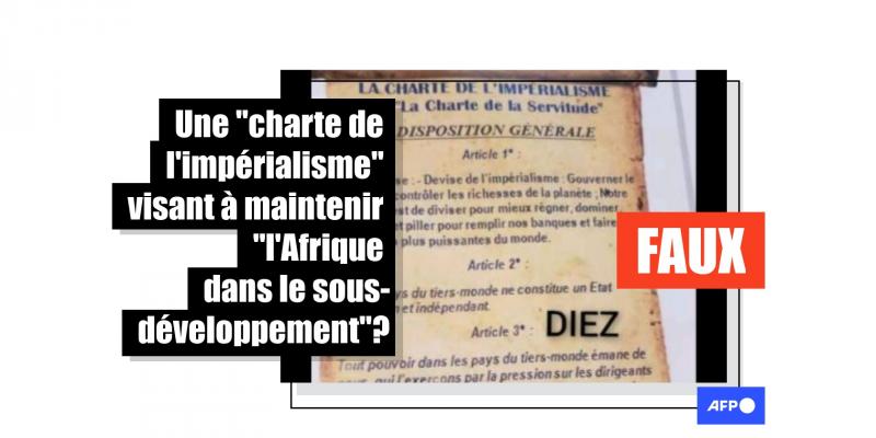 Un message partagé plus de 400 fois sur Facebook depuis avril 2021, et qui circule également sur WhatsApp en Afrique, montrerait une "charte de l'impérialisme". Selon les internautes qui en partagent différents extraits, ce document aurait été élaboré à la fin du XIXe siècle. Il s'agirait d'un accord secret entre les "puissances occidentales" afin de "gouverner le monde et contrôler les richesses de la planète" mais également "dominer, exploiter et piller" les pays du "tiers-monde". Attention : ce document, qui présente par ailleurs de nombreux anachronismes, est un faux.