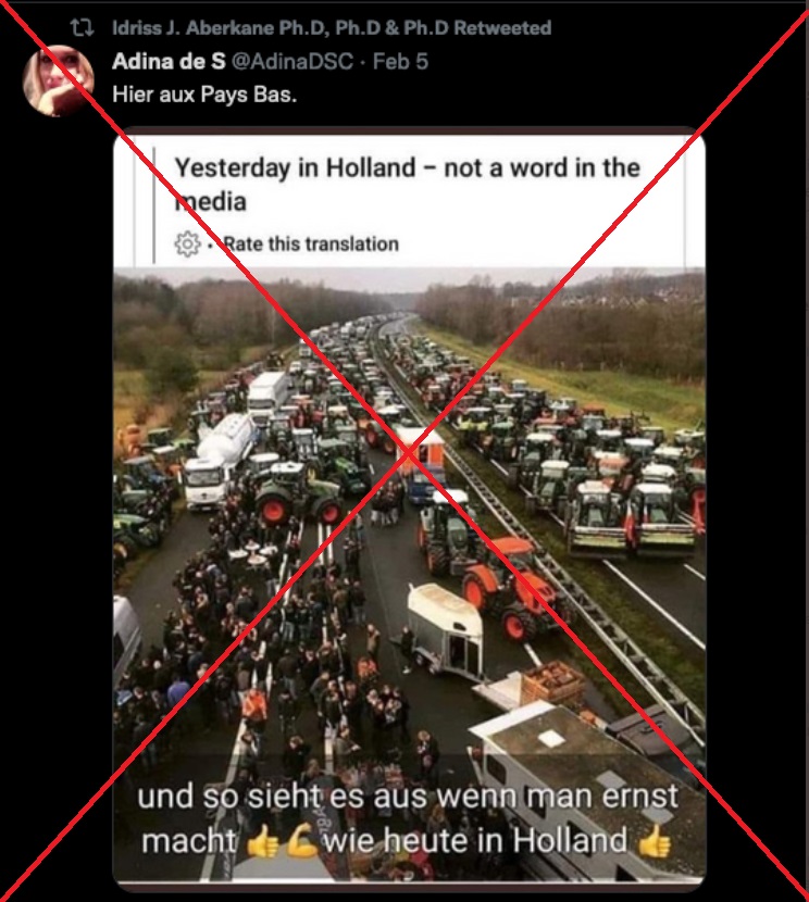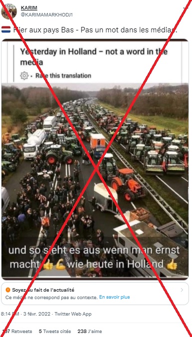 "Hier aux pays Bas - Pas un mot dans les médias", prétend un tweet partagé des centaines de fois depuis le 3 février, accompagné d'une photo montrant des tracteurs entourés de manifestants bloquant une route à double sens.