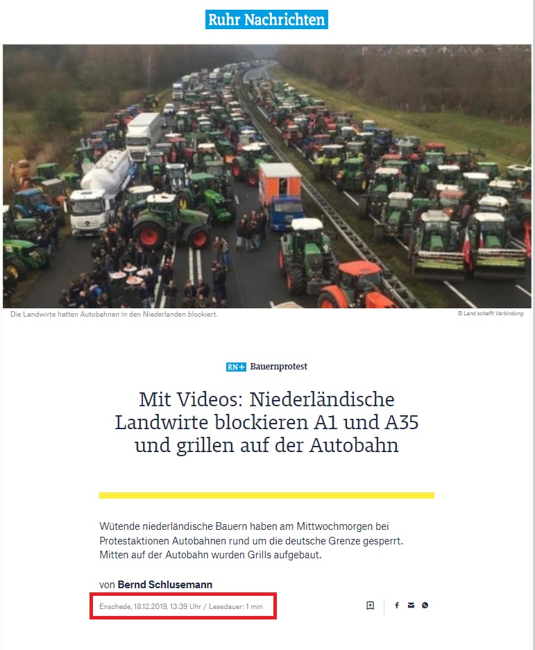 L'article indique que des agriculteurs néerlandais avaient bloqué une route avec des tracteurs, des camions et d'autres véhicules, près de la frontière allemande, le mercredi 18 décembre 2019.