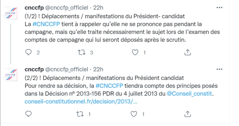 Face aux questionnements et aux interpellations, la CCNFP a rappelé le 8 février sur son compte Twitter qu'elle ne se "prononçait pas pendant la campagne" mais a précisé qu'elle traitait "nécessairement le sujet lors de l’examen des comptes de campagne qui lui seront déposés après le scrutin". "Pour rendre sa décision, la CNCCFP tiendra compte des principes posés dans la décision" du Conseil constitutionnel du 4 juillet 2013, ajoute l'instance.