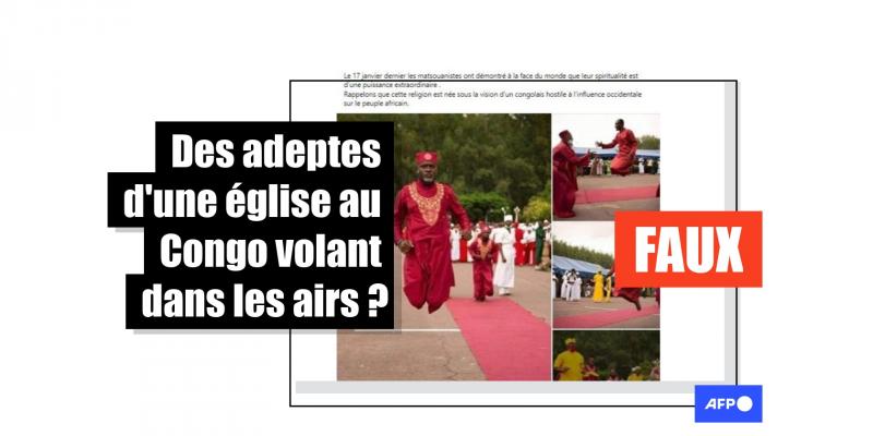 Des publications cumulant plus d’un millier de partages sur Facebook depuis le 22 janvier 2022 prétendent montrer, photos à l’appui, "la puissance extraordinaire" des adeptes d’une église congolaise, capables de "s’envoler". Contacté par l’AFP, l’auteur de ces clichés explique qu’en réalité, on y voit les membres d'un mouvement religieux appelés "les matsouanistes" en train de sauter et non de voler. Il s'agit d'un rite de cette église.