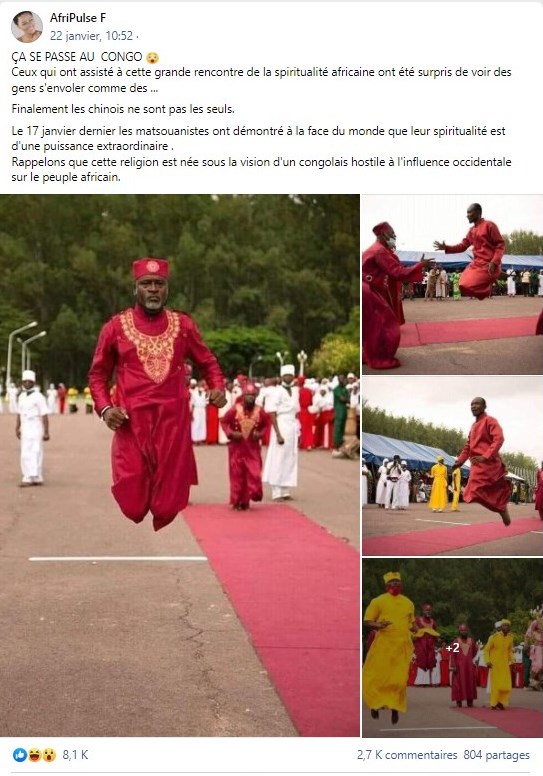 Une compilation de cinq photos montre des hommes vêtus de tunique, rouge vif pour les uns, jaune pour les autres. Certains sont à plus d’un mètre du sol. “ÇA SE PASSE AU CONGO”, commente l’auteur d’une publication partagée près de 1.000 fois depuis le 22 janvier. "Ceux qui ont assisté à cette grande rencontre de la spiritualité africaine ont été surpris de voir des gens s'envoler", ajoute-t-il. Ils s'envolent "comme dans les films chinois", lit-on dans d'autres publications (1,2).