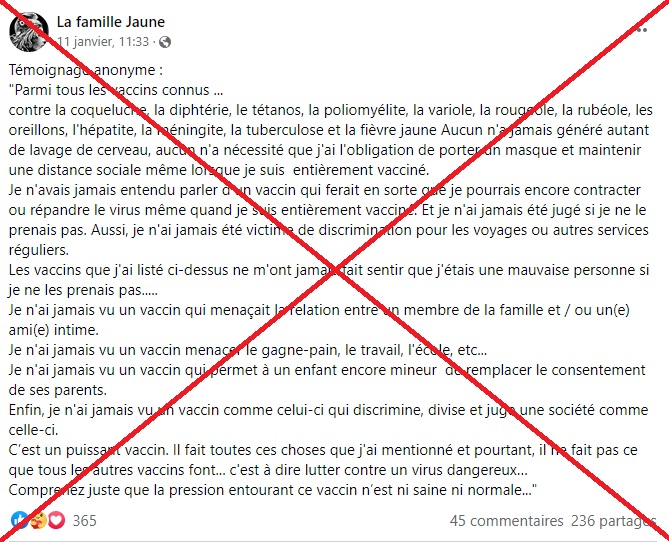 L'auteur du texte compare les vaccins contre le Covid-19 aux vaccins contre de nombreuses autres maladies et conclut à l'inefficacité du vaccin. "Parmi tous les vaccins connus...contre la coqueluche, la diphtérie, le tétanos, la poliomyélite, la variole, la rougeole, la rubéole, les oreillons, l'hépatite, la méningite, la tuberculose et la fièvre jaune, aucun [...] n'a nécessité que j'ai l'obligation de porter un masque et de maintenir une distance sociale même lorsque je suis entièrement vacciné", peut-on lire. "Je n'avais jamais entendu parler d’un vaccin qui ferait en sorte que je pourrais encore contracter ou répandre le virus même quand je suis entièrement vacciné."