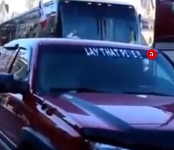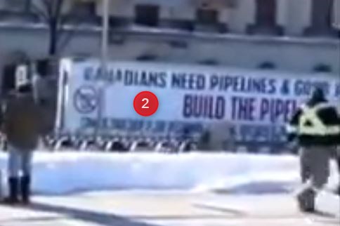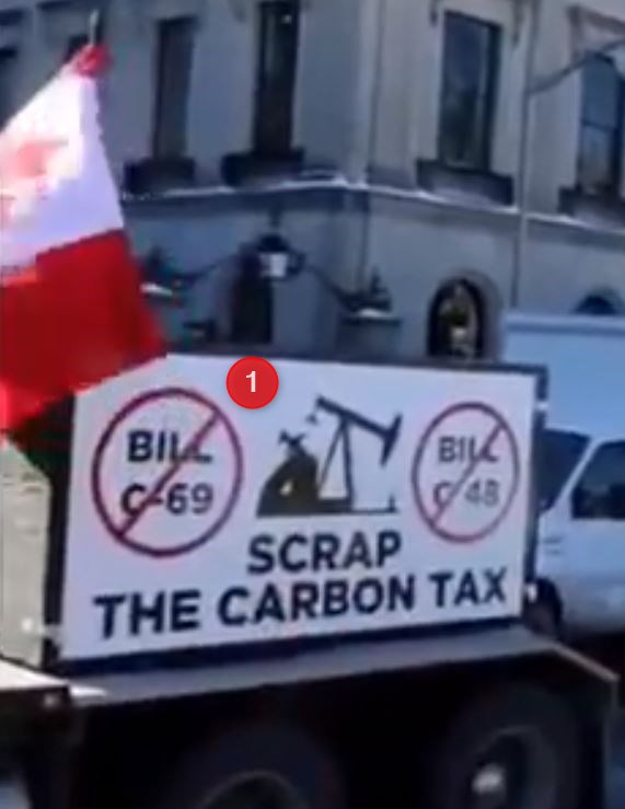 A la 7e seconde de la vidéo twitter, la pancarte d'un camion floqué d'un drapeau canadien indique "scrap the carbon tax"(abandonne la taxe carbone). A la 30e seconde, un autre bandeau, écrit, lui : "Canadians need pipelines and good paying jobs. Build the pipeline " (les Canadiens ont besoin de pipelines et d'emplois bien rémunérés. Construisez le pipeline". Enfin, à la 43e seconde, il est écrit en blanc sur le pare-brise d'une voiture "lay that pipe" (pose ce tuyau).