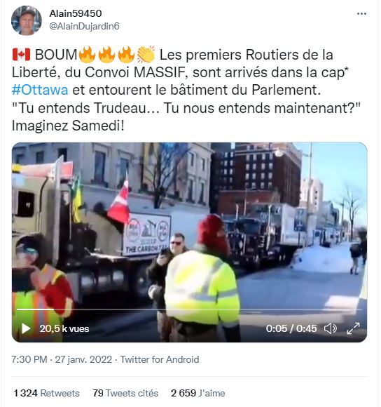 "Les premiers Routiers de la Liberté, du Convoi MASSIF, sont arrivés dans la cap* Ottawa et entourent le bâtiment du Parlement. "Tu entends Trudeau... Tu nous entends maintenant?" Imaginez Samedi!", écrit un internaute dans un tweet partagé plus de 1.300 fois en 24 heures.
