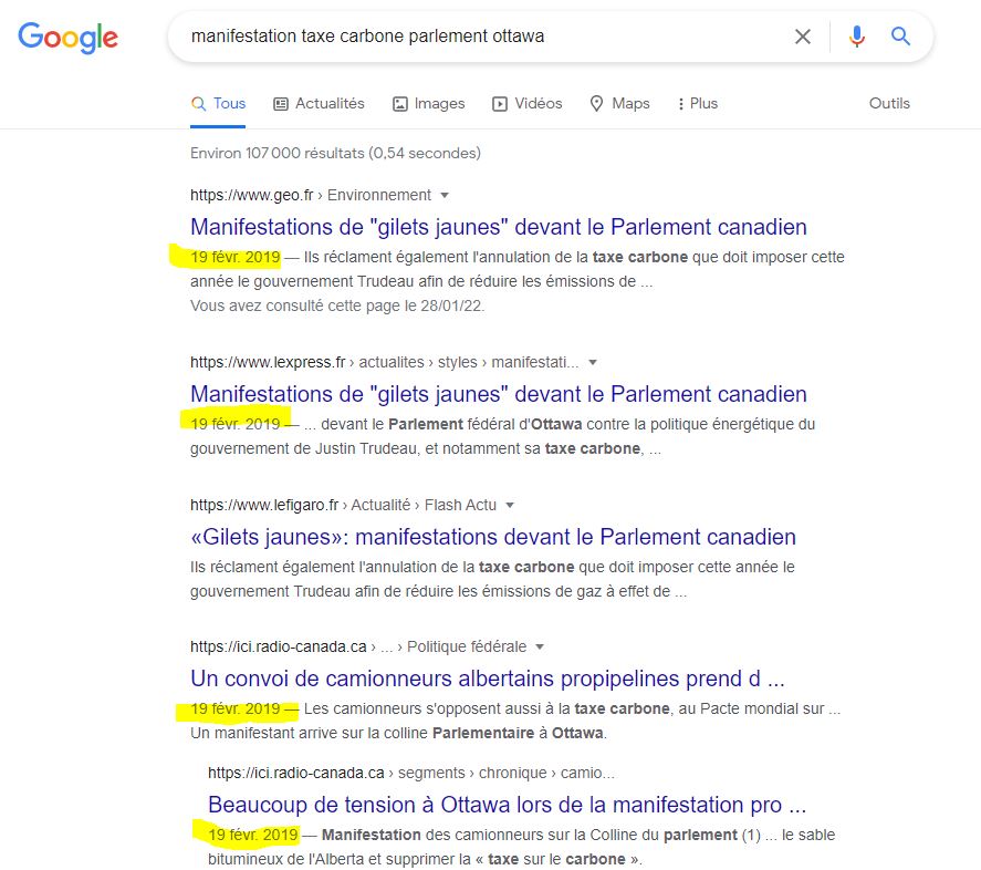 En tapant les mots-clés "manifestation taxe carbone parlement ottawa" sur Google, plusieurs articles datés du 19 février 2019 ressortent.