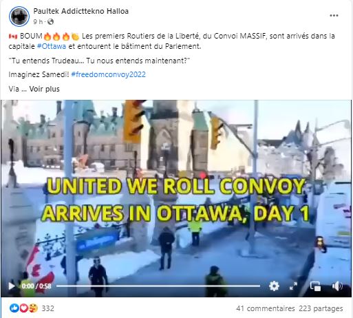 Une autre version un peu plus longue de la vidéo publiée sur Twitter, cette fois relayée le 27 janvier 2022 sur Facebook, s'appelle ainsi "United We Roll Convoy arrives in Ottawa Day 1".