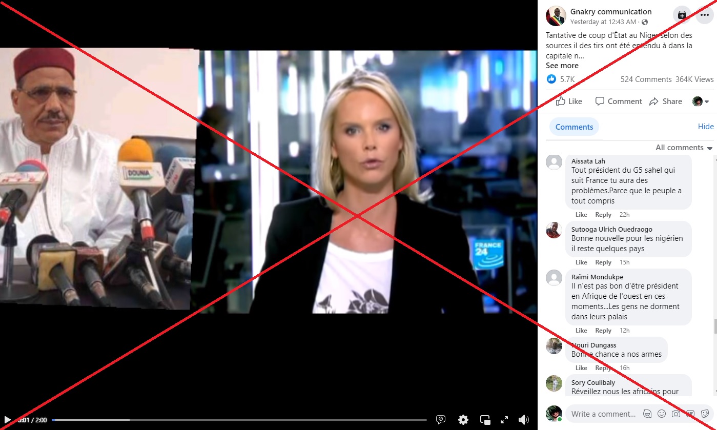 "Des tirs ont été entendu dans la capitale nigérienne, c'est ce qu'affirment plusieurs témoins sur place" à Niamey, la capitale nigérienne, annonce une présentatrice dans une vidéo de deux minutes très largement relayée sur les réseaux sociaux au Mali. Dans le coin inférieur droit de la vidéo, le logo de la chaîne française France 24 - et à gauche, une photo de Mohamed Bazoum, l'actuel président du Niger.