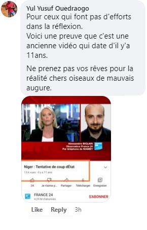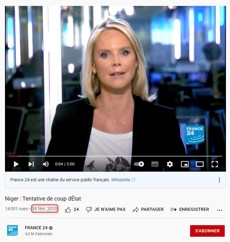 Attention cependant: cette vidéo, qui vient bien de France 24, date en réalité de février 2010, soit plus de douze ans avant le prétendu "coup d'Etat" évoqué par les internautes qui la partagent. Au 2 février 2022, aucune tentative de coup d'Etat récente n'a été rapportée au Niger.
