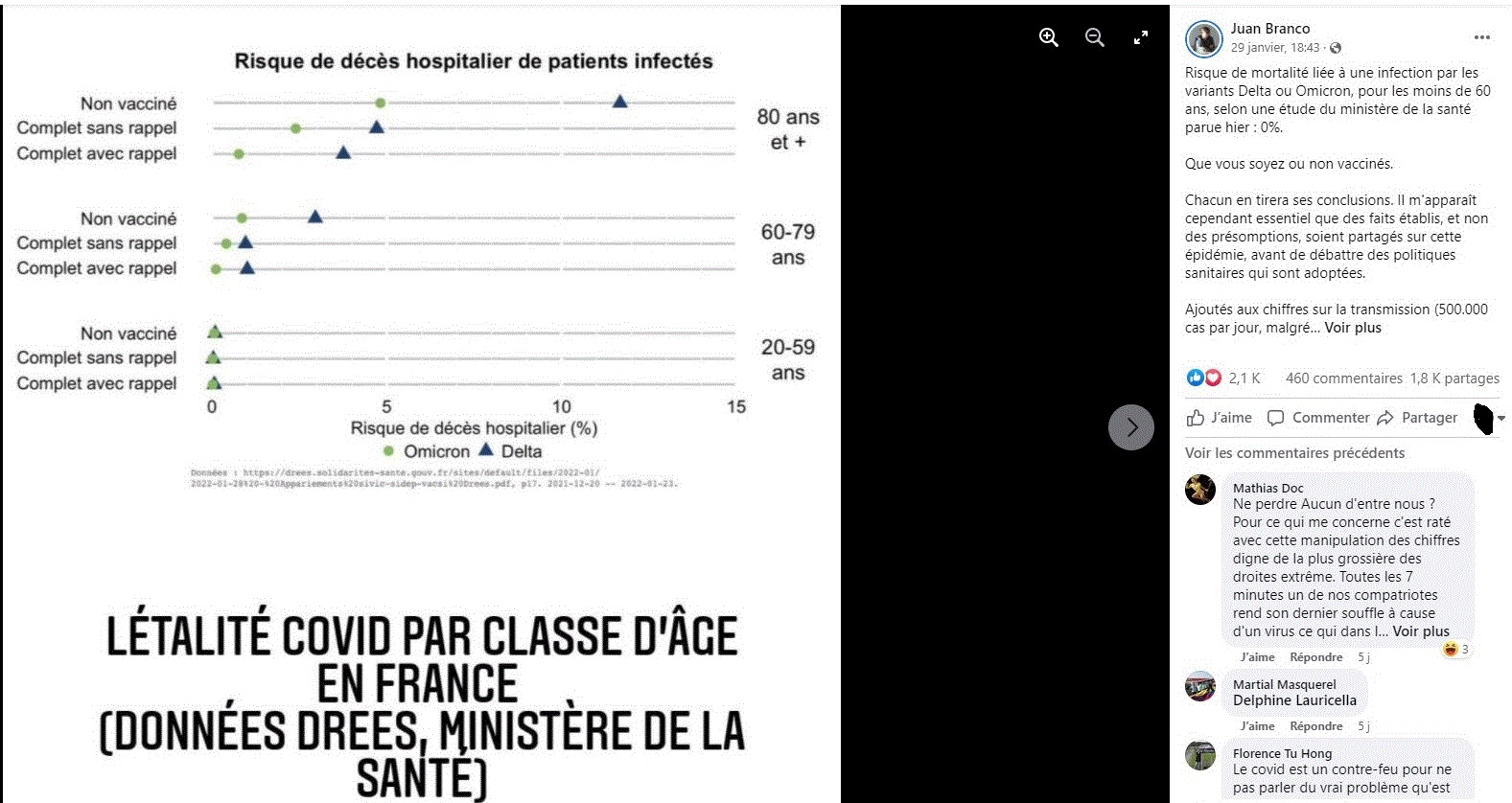 "Risque de mortalité liée à une infection par les variants Delta ou Omicron, pour les moins de 60 ans, selon une étude du ministère de la santé parue hier : 0%. Que vous soyez ou non vaccinés", a écrit sur Facebook le 29 janvier, en en-tête d'un texte plus long remettant en cause le passe vaccinal, l'avocat Juan Branco, notamment connu pour le succès de son pamphlet anti-Macron "Crépuscule". Le post, qui contient un texte et un graphique sur les décès, a été partagé 1.800 fois depuis sur Facebook.