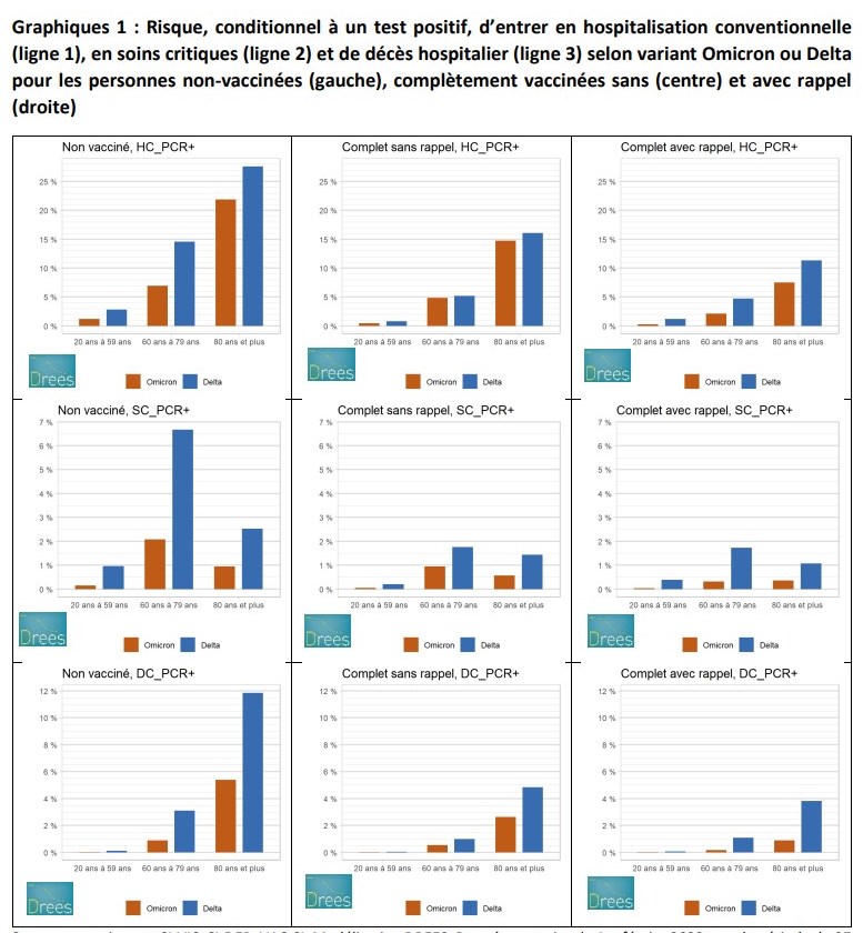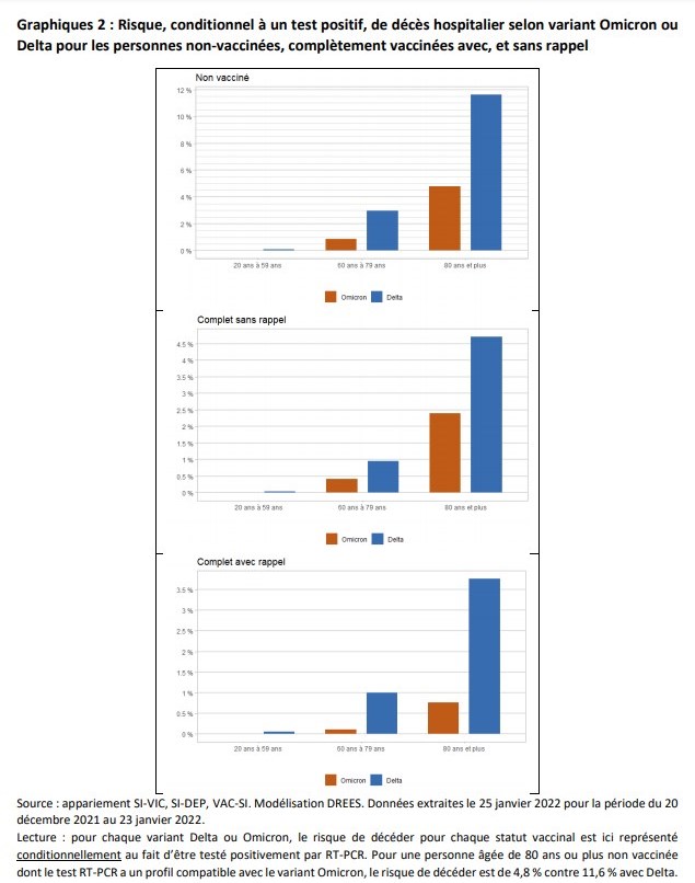 Le "Graphique 2" y montre le "Risque, conditionnel à un test positif, de décès hospitalier selon variant Omicron ou Delta pour les personnes non-vaccinées, complètement vaccinées avec, et sans rappel": autrement dit, les mêmes infos que le graphique partagé sur internet mais visualisées différemment. Quand on avait trois lignes parallèles, la Drees avait visualisé ses données avec des barres verticales colorées, sur trois tableaux différents.