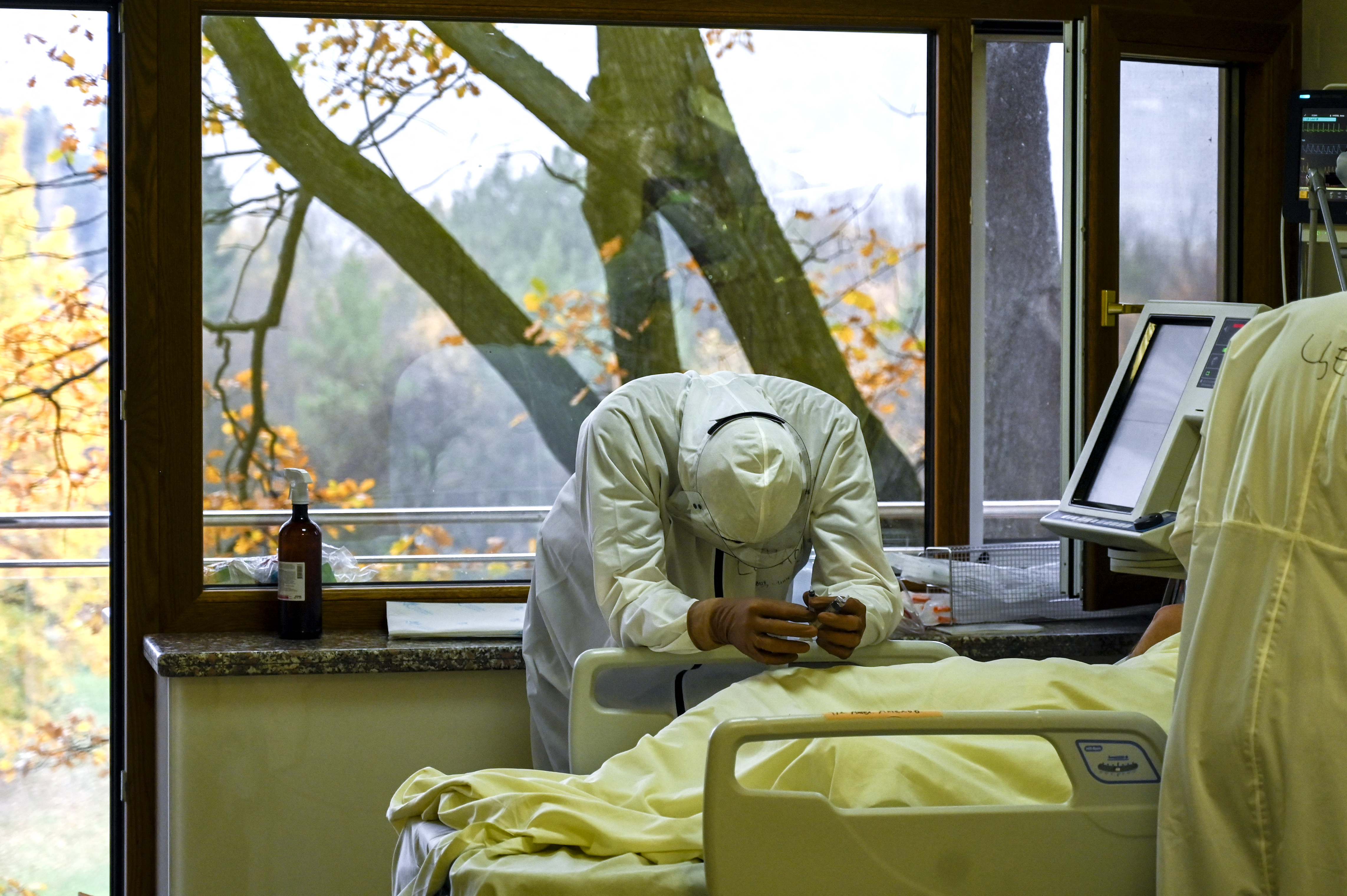 Un soignant auprès d'un malade du Covid dans un hôpital de Sofia (Bulgarie) en novembre 2021 ( AFP / NIKOLAY DOYCHINOV)