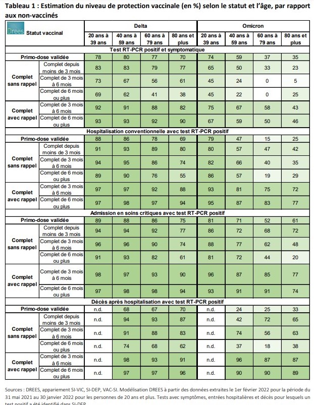 Le tableau ci-dessous, issu de la même note de la Drees, vient confirmer la protection conférée par les vaccins, selon les schémas vaccinaux, les variants et les tranches d'âge.