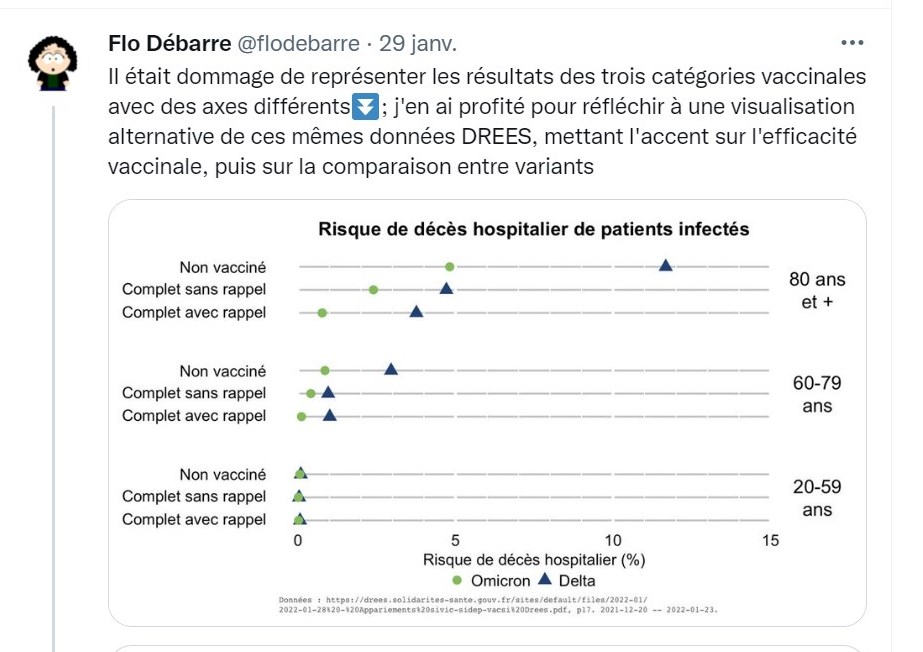 Florence Débarre a expliqué en détail son travail à l'AFP lors d'un entretien téléphonique le 4 février. Son idée était de proposer une autre "visualisation de données" que celle de la Drees, qui selon elle comportait des difficultés de lecture, notamment compte tenu des échelles différentes utilisées pour chaque statut vaccinal. L'échelle de risque de décès des non vaccinés allant en effet de 0 à 12%, celle des vaccinés sans rappel, de 0 à 4,5% et celle des vaccinés avec rappel de 0 à 3,5%.