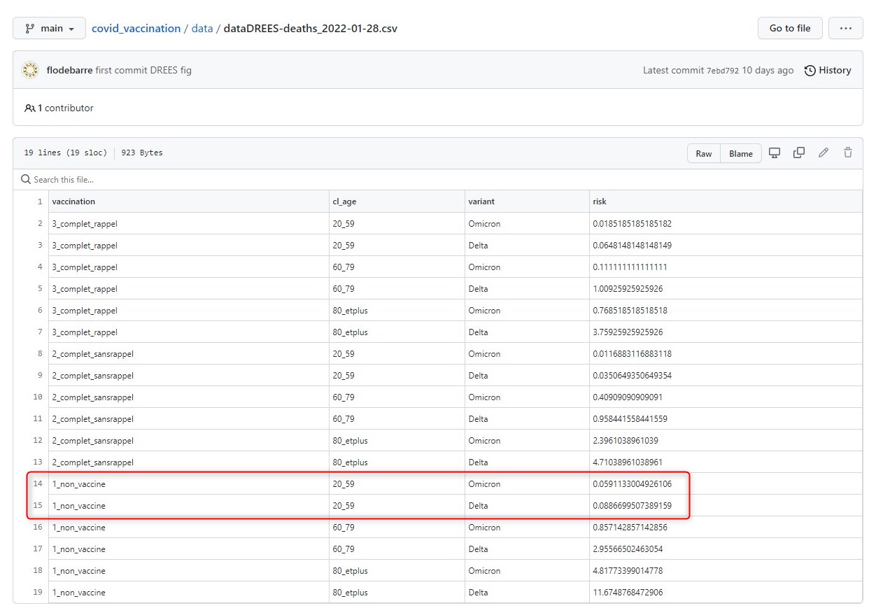 On trouve aux lignes 14 et 15 (20-59 ans, Omicron et Delta, respectivement), les valeurs 0.0591133004926106 (arrondie dans le post Facebook à 0,06) et 0.0886699507389159 (arrondie à 0,2%).