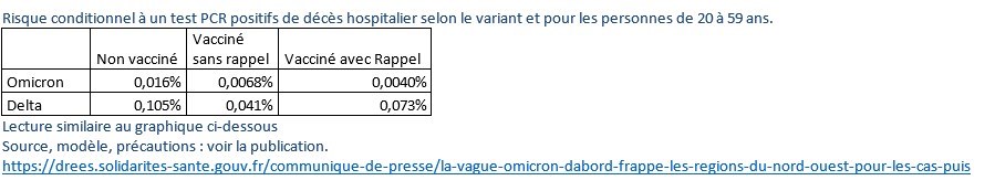 Dans le graphique de la Drees, on remarque que le risque de décès pour les 20-59 ans est visuellement peu lisible: on ne distingue pour le variant Delta qu'un trait à la lisière du niveau 0, juste un tout petit peu plus épais pour - paradoxalement - les vaccinés. Pour Omicron, on ne distingue même aucun trait. On peut rapidement, et de façon très peu précise, en déduire que le risque de décès est peu ou prou de 0 pour cette tranche d'âge.